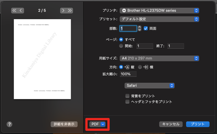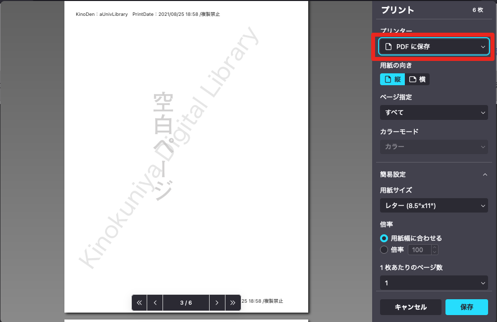 印刷ボタンクリック後に表示されるブラウザの印刷ダイアログにて、下部『PDF』プルダウンから『PDFで保存』を選択します。